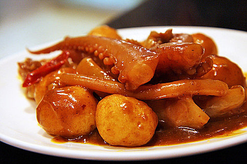 第二張 咖哩雙拼~這是魚蛋(魚丸)和魷魚的雙拼,淋上非常夠味的咖哩醬,真的超好吃! 魚丸軟Q,魷魚不硬有彈性,很棒! 咖哩醬帶辣又濃,超讚的啦! 一份80元~