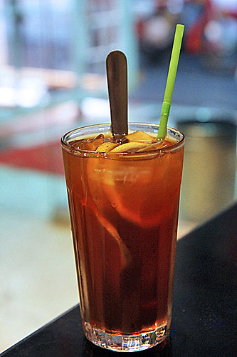 第五張 來茶餐廳必點的飲料---凍檸茶,有三片檸檬,所以味道滿濃的喔! 茶味比較淡一點,不過整體來說不錯了! 一杯60元~