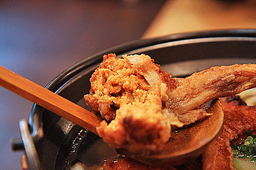 第二張 明太子翅膀雞塊烏龍麵~這也是新產品和主廚推薦的,所以吃看看囉! 雞塊是無骨的,肉非常嫩喔! 重點是雞翅,裡面有包裹明太子(醃製鱈魚卵),雞翅微辣,真是超美味! 湯頭很清甜,但是吃到最後會覺得有一點鹹~小碗250,中碗280,大碗310元~