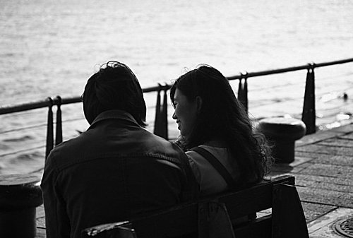 第二張 淡水是情侶喜歡去的地方,這種景象到處可見囉!(2008/5/17 15:51 光圈優先 光圈2.8 快門1/320秒 ISO100 鏡頭焦距55mm 後製黑白)