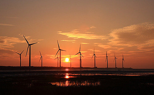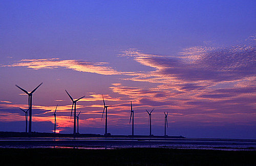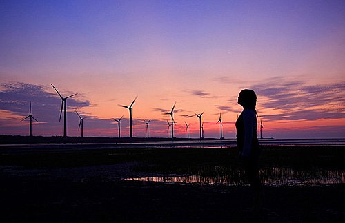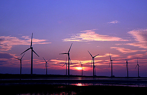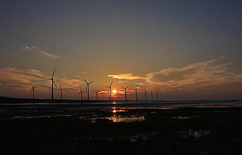 第二張 高美溼地的風車是最有名的標的物,遠遠就能看到!夕照染紅整個天地了~~ (2008/4/7 18:05 光圈優先 光圈16 快門1/60秒 ISO100 鏡頭焦距40mm)